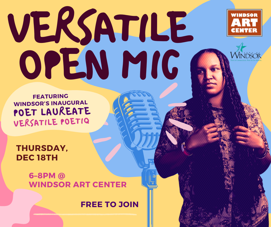 You may recognize Versatile from hosting Dr. Martin Luther King Jr. Birthday Celebrations and Juneteenth Open Mic events at Windsor Art Center for the past two years. We’re lucky to be adding these monthly open mic nights to our growing list of collaborations with Windsor’s Inaugural Poet Laureate!