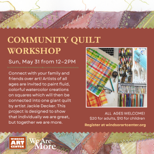 RegisterInstructor: Jackie Decker Sunday, May 31 from 12-2pm $20 for adults, $10 for children ages 5–17 Held in: Windsor Art Center gallery Connect with your family and friends over art! Artists ages 5–100 are invited to paint fluid, colorful watercolor creations on squares which will then be connected into one giant quilt by We Are More artist…